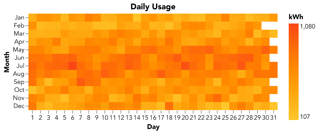 Design a Vega-Lite chart that shows a heat map of ... with ... on the x axis and ... on the y axis