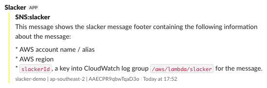ap-southeast-2) slackerId, (AAECPR9qbwTqaD3o) a key into the CloudWatch log group/aws/lambda/slackerfor the message.